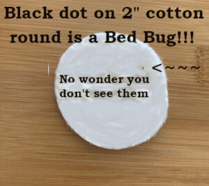 Black dot on 2 inch cotton round! A bed bug for sure, that’s what I thought. But no, it’s not. It’s a mite that came in under the wall between my apartment and the one next door. It’s a scabies mite… and getting rid of them once they burrow under your skin and lay eggs, is horrendously difficult.