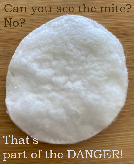 Even worse is when they bite! The bites are quite painful, way out of proportion painful relative to their size. And for some reason, say you’ve been happily working on your computer, no bites, and an important call comes in… you answer, and within a minute a mite is biting you. Maybe you could keep your focus on the call, I can’t. The combination of pain and knowing the little arachnid will make itself at home in my body if I don’t do something, forces me to ask the caller if I can call back.
