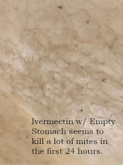 Recently I’ve noticed that in pictures I take of cotton rounds with mites from my arm, or wherever, the mites as much larger black spots, without any waiting for the mites to die, than in pictures I take a few days after using Ivermectin, or after using Ivermectin with food.